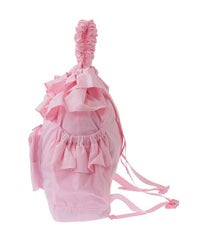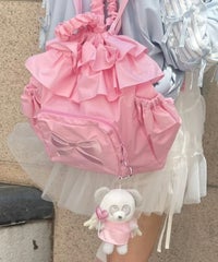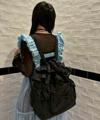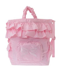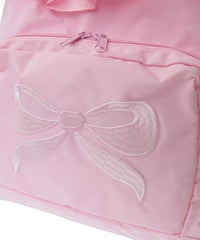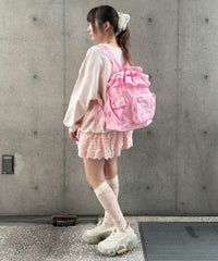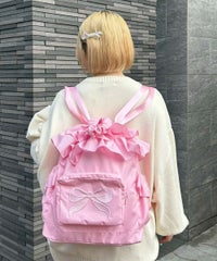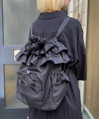 リボンモチーフの刺繍がキュートなバックパック ●巾着型で荷物の出し入れも簡単 ●フリルディティールを取り入れたガーリーなデザイン、リボンモチーフのぷっくりとした刺繍がアクセントに ●広めのマチで見た目以上の収納力! ●薄手のナイロン素材で丈夫で軽い仕様 ●500mlのペットボトルや折り畳み傘の収納に最適なサイドポケット ●財布やスマホなど小物の収納に便利なジッパー&マチ付きのフロントポケット ●肩ひもは長さ調節が可能 ●内側にもファスナー付きポケットを配置し、細かい荷物にも配慮 ●普段使いはもちろん、アウトドアやフェス、旅行まで幅広く活躍するバッグ ■仕様 ・マチあり ・A4サイズ収納可能 ・メイン開締:巾着仕様 ・フロント:ファスナーポケット ・内側:ファスナーポケット ・側面:サイドポケット×2