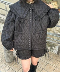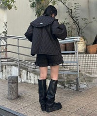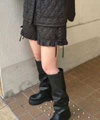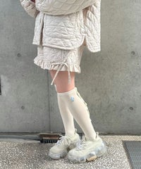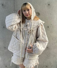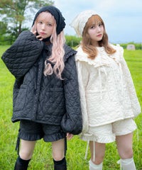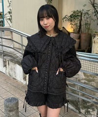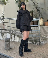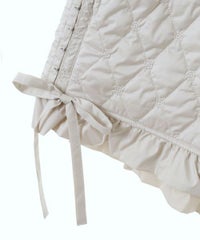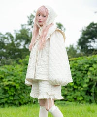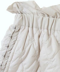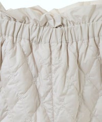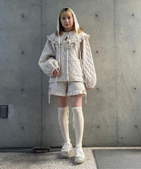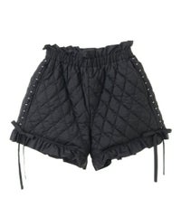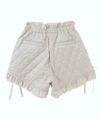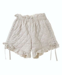 ダイヤ柄とクロスモチーフを組み合わせたキルティング素材を使用したショーツ。 両サイドにホックテープを使用しモード感をプラス。 裾にフリルとリボンをあしらい大人可愛いフェミニンな雰囲気を演出。 マットなタフタ素材で、柔らかく肌触りの良い風合い。 たっぷりと分量感をとった裾幅広めのキュロット型なので脚の細見せ効果も◎ ウエスト部分はゴム仕様でリラックスな履き心地。 両サイドと後ろにポケット付きで機能性も。 同シリーズのジャケットを組み合わせた着こなしがオススメです。