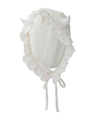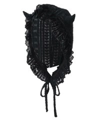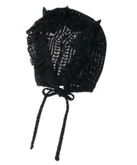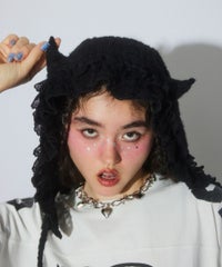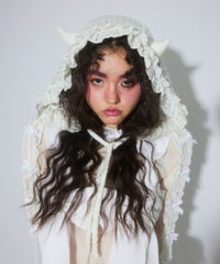 とびきりキュートなデビルホーンつきボンネットが登場!●起毛レースを使用した、キュートなボンネット●立体的なデビルのツノで、キャッチーなスタイリングが楽しめます●いつものスタイリングにプラスオン!でガラリと雰囲気を変えられる一点●首まわりのサイズ感は、ドロストで調節が可能です