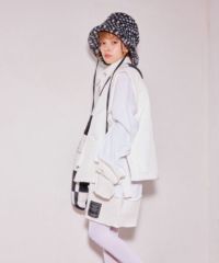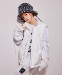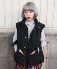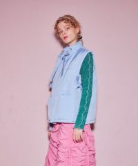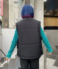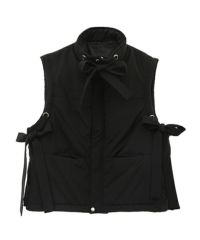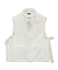 両サイドのリボンディティールが目を惹く中綿入りベスト。 中綿には3M社の高性能中綿素材シンサレートを使用。 1枚ではもちろん軽めのアウターの上からレイヤードした着こなしもオススメ。 スタイリングのアクセントにぴったりな万能アイテム。
