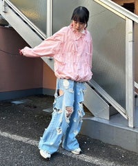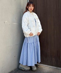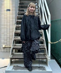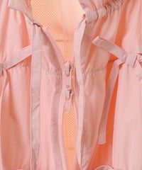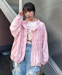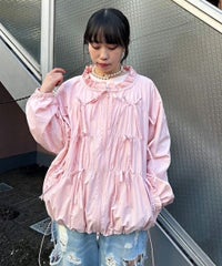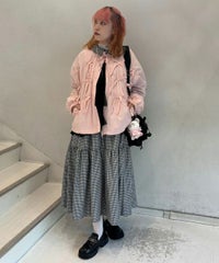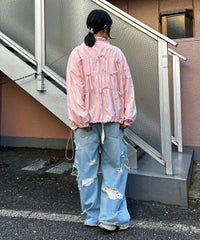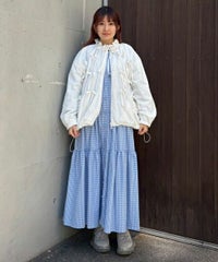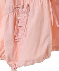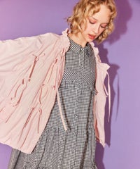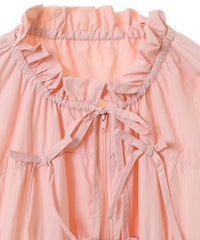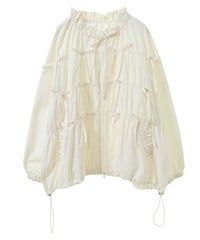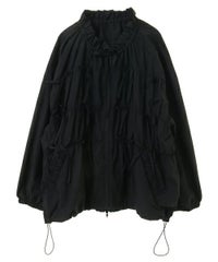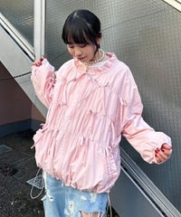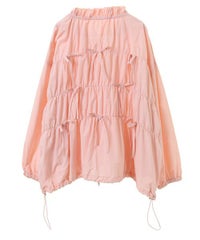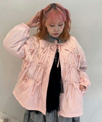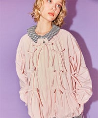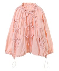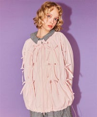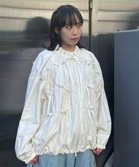 リボンディティールをふんだんに施した、スタンドネックのナイロンブルゾン。 ギャザーを寄せて立体感を出しつつも着太りして見えないシルエットにこだわりました。 軽やかなタフタ素材を使用しており気軽に羽織れる一枚。 程よいサイズ感の身頃感&着回ししやすい丈でロングシーズンご着用いただけます。