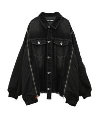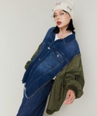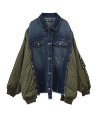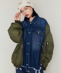 デニムジャケットとMA-1をドッキングしたリメイク風のデザインがインパクト大なジャケット。 10.6オンスのデニム素材とエステルツイルを組み合わせ軽やかな着心地に。 オーバーシルエットですが、部分的に中綿を無くす・薄手にすることで着膨れして見えないように仕上げています。 フロント部分にファスナーを付けておりファスナーを開けたスタイリングもオススメです。 キャンディならではのギミックの効いた1枚をお楽しみください。