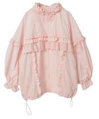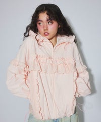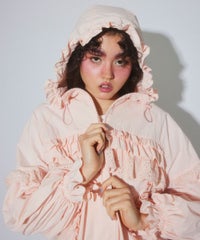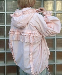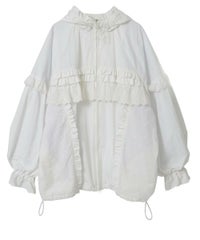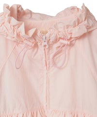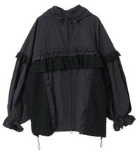 リップストップとコットンレースを組み合わせガーリッシュにアレンジされたトラックジャケット。大きなフードはぎゅっと絞ってベビーライクにアレンジしても◎袖にギャザーをたっぷり入れ、丸みのあるボリューム袖に仕上げました。身体のラインが出にくいゆったりとしたシルエットで、着心地がとても軽く、ストレスフリーなのも嬉しいポイント。裾はドローコードで絞ることでシルエットを変えてお楽しみいただけます。逆開ファスナーを使用しているので、ファスナーを半開にしてインナーを見せるコーディネートもオススメです。・ ・・・・・・・・・ ・・・・・・・・・透け感:なし・伸縮性:なし・生地の厚さ:薄手・裏地:あり(メッシュ素材)・ポケット: あり・ ・・・・・・・・・ ・・・・・・・・