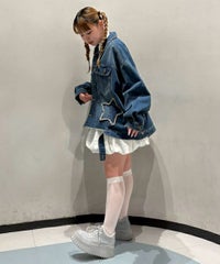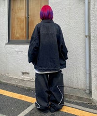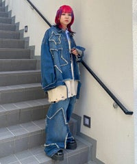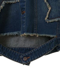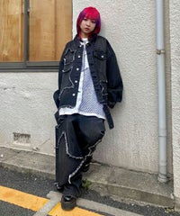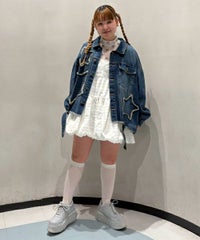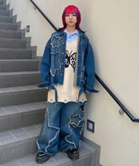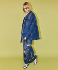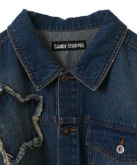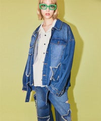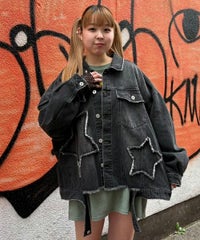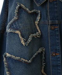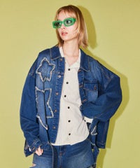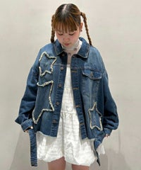 星型のパッチがポイントのリメイク風デザインのデニムジャケット。 着用した際にシルエットがキレイに見えるように10.8オンスの しっかりとした厚みのデニムを使用しています。 ヴィンテージライクな風合いの加工もポイント。 オーバーシルエットなのでユニセックスでお楽しみいただけます。 同じ素材・ディティールを使用したパンツを組み合わせて セットアップで着こなしていただくのもオススメ。 春先はもちろん、長い期間でご着用いただける1着です。