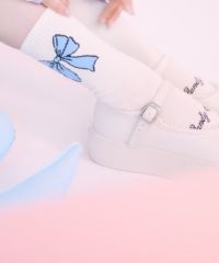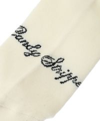 リボンモチーフをジャガードで編み立てたリブソックス。 甲部分に入ったガーリーなロゴもポイント。 足裏部分はパイル仕様でクッション性も抜群。