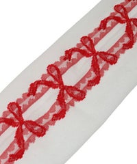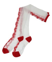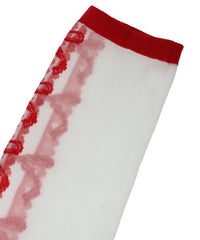 リボン柄のシアー素材のニーハイソックス。 前中心にリボン柄を配置することで「I」ラインが強調され脚長効果も期待できます。 ガーリーなアイテムとはもちろん、ショート丈のボトムとも相性◎ コーディネートのアクセントに最適な1足です
