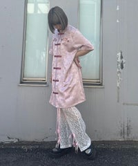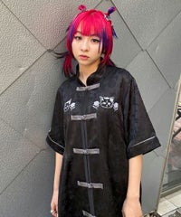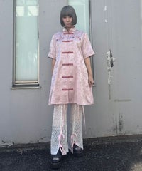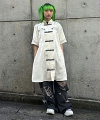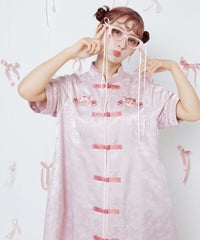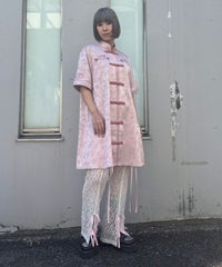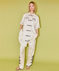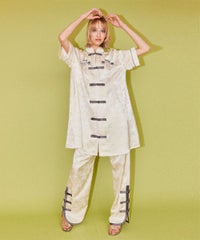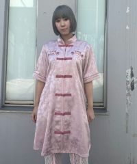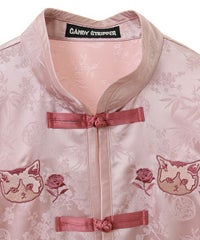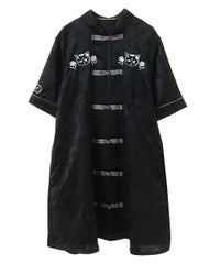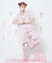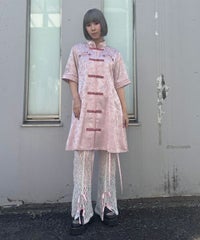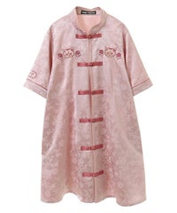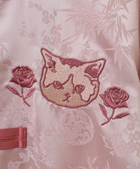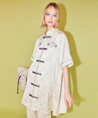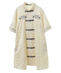 チャイナ風のディティールが目を惹くワンピース。 高級感のあるサテン生地を使用し、フロントには猫モチーフをさりげなく刺繍しました。 前を閉めてワンピースとしても、開けて羽織としてもご着用いただけます。 同シリーズのパンツと合わせたコーディネートもおすすめです。