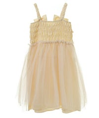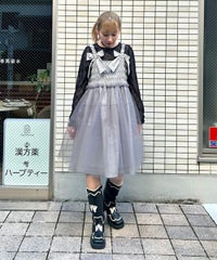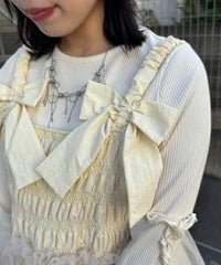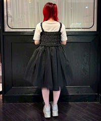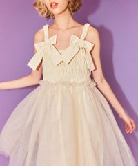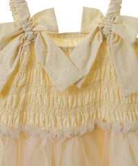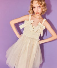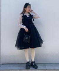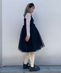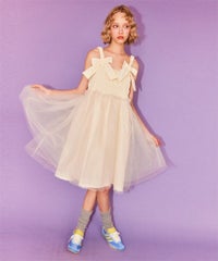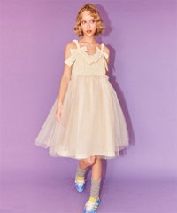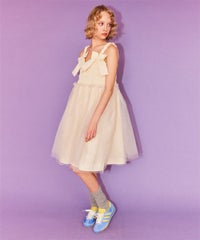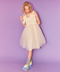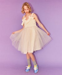 肩紐にリボンディティールがキュートなドレス。 スカート部分にはハードチュールを重ねボリューミーなシルエットに。 身頃部分はシャーリングディティールを取り入れることで、 シルエットにメリハリが出て着膨れして見えずスッキリとしたバランスでご着用いただけます。 1枚ではもちろん、トップスやボトムを組み合わせたレイヤードスタイルもオススメ。 タウンユースはもちろん、オケージョンなどドレスアップするシーンにも最適。 組み合わせ次第で様々なシーンでご着用いただけます。