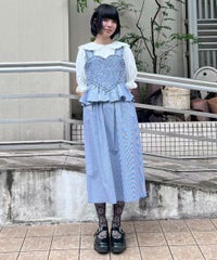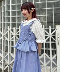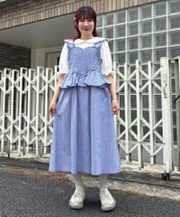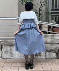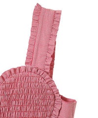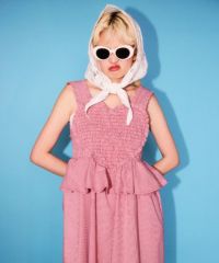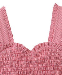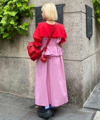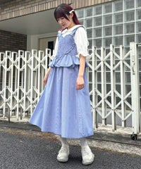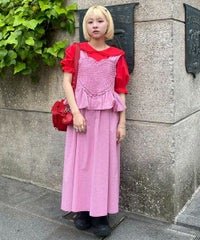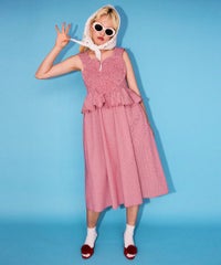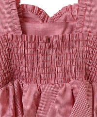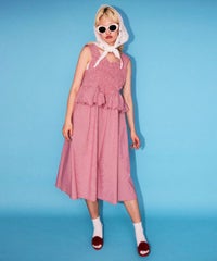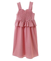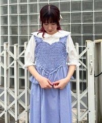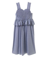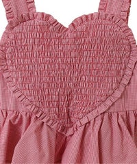胸元の大きなハートモチーフがキャッチーなワンピース。 春夏にぴったりなギンガムチェック素材を使用しガーリーに仕上げました。 バックはファスナーで着脱も簡単◎ 後ろに入ったシャーリングで、程よく身体にフィットします。