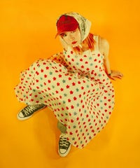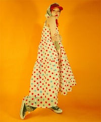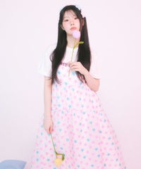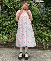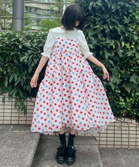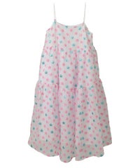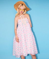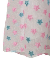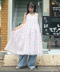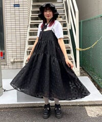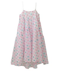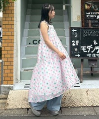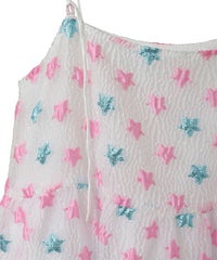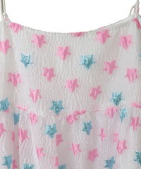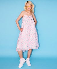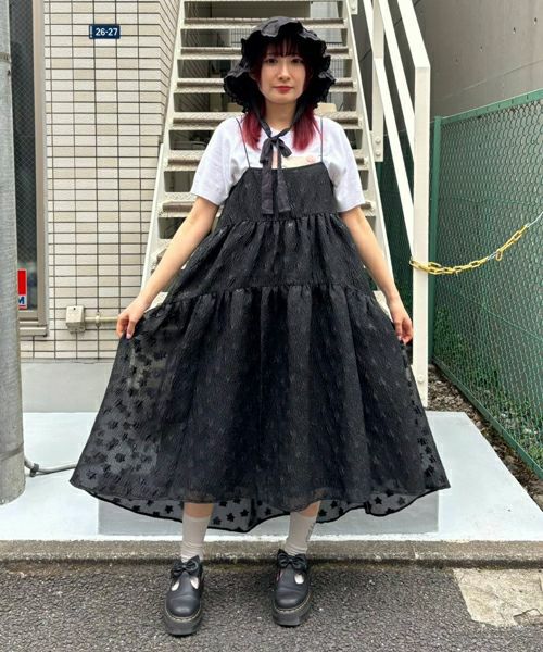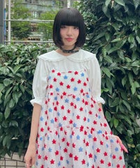 オーガンジーに星柄ジャガードを施したCandy Stripperオリジナル素材のドレス。 透け感のある軽やかな質感。 星柄のカラーリングはキャンディ仕様のオリジナルカラーにアレンジしました。 切り替え位置を上に設定し着丈を前後で差を付け、スカート部分はティアードを入れ裾に向かって広がる Aラインシルエットにすることで着膨れして見えないように仕上げました。 肩紐はサイズ調整が可能となっており、着こなしに合わせてアレンジしていただけます。 Tシャツやデニムを組み合わせてカジュアルダウンした着こなしもオススメ。 パステルなカラーリングのピンク×ライトブルーとポップなカラーリングをお楽しみいただける レッド×ブルー、モードな雰囲気のブラックの3色をご用意。 1枚で主役級にキマるアイテムです。