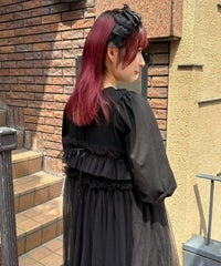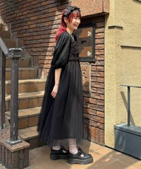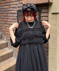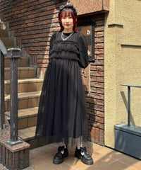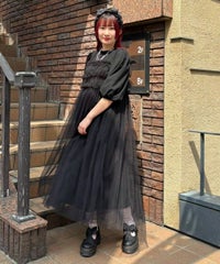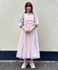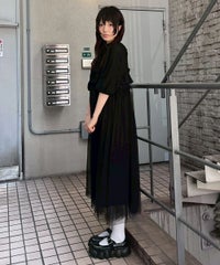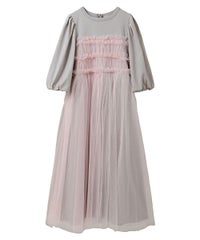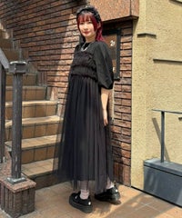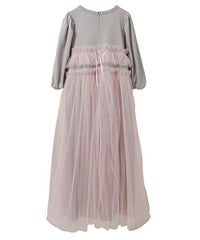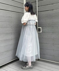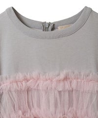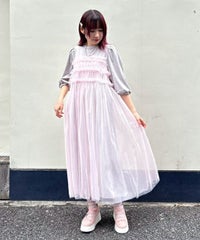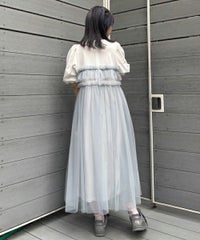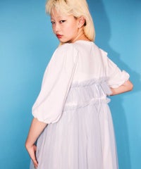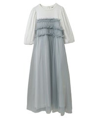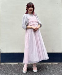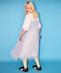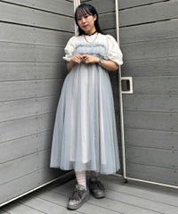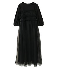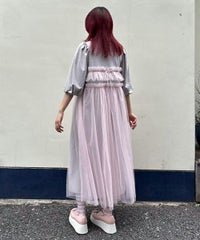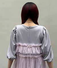 ランジェリーディティールのチュールワンピースをドッキングしたレイヤード風デザインのワンピース。 軽やかなカットソー素材のワンピースは身体のラインを拾いにくい落ち感のあるシルエット。 袖のパフスリーブはバストレングスにすることで可愛らしくなり過ぎないようにアレンジしています。 身頃部分のチュールはギャザーとフリルのディティールを取り入れレディライクなムードを演出。 バックスタイルには細めのサテンリボンを付け、さりげないアクセントをプラス。 たっぷりギャザーを施していますが、着膨れして見えない程よいボリューム感に仕上げています。 タウンユースはもちろん、観劇やイベントなとに最適な1枚です