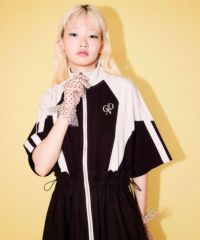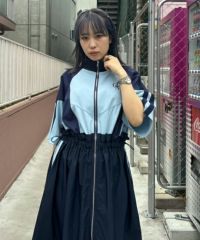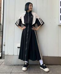 切替配色がスポーティなトラックジャージにギャザースカートをドッキングたしたロングワンピース。 ジャージ部分は軽やかで、程よい伸縮性のあるエステルポンチ素材を使用。 スカート部分は張りのあるタフタ素材を使用。たっぷりとギャザーを施し、ふんわりと広がる立体的なシルエットに。 ウエストにはドローコードを通しており、お好みのバランスにアレンジが可能です。 きゅっと絞ると女性らしいシルエットに。ゆるっと伸ばすと身体のラインを拾いにくい落ち感のあるシルエットになり、 着る人を選ばすストレスフリーな着心地です。 1枚でワンピースとしてはもちろん、ファスナーを開けて軽めのアウターとしてもご着用いただけます。 タウンユースはもちろん、ライブやレジャーシーンなどのイベントにも最適です。