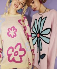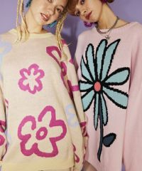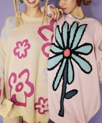 手描きのフラワーモチーフをジャガード編みで表現したニットトップス。 程よくしっかりとした厚みのコットンアクリルのニット。 ふっくら柔らかく、着心地の良い快適な素材です。 ゆったりとしたオーバーサイズなシルエットで、1枚でワンピースとしても、ボトムを組み合わせてトップスとしても、お好みで着用していただけます。