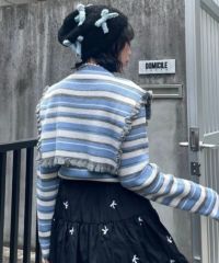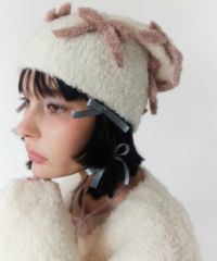 ニット素材のリボンを散りばめたビーニー。 ボディのカラー展開によってリボンのカラーリングが異なります。 ガーリーなスタイリングにはもちろん、カジュアルなスタイリングのアクセントとしても◎ 同シリーズのカーディガン、パンツとのコーディネートもおすすめです。