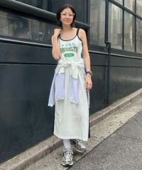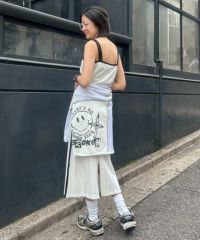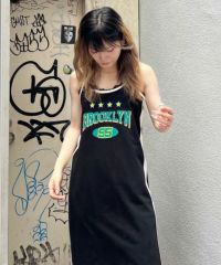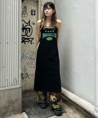 Y2Kなムードをデザインに落とし込んだ初夏のスタイルに最適なキャミソールワンピース。 プリント部分はクラック風に仕上げヴィンテージライクな質感を演出。 両サイドに共布のラインを入れて縦ラインを強調することでスタイルアップ効果も。 後ろ側にはスリットを入れることで動きやすく機能性も◎ タイトすぎないシルエットに仕上げているので1枚ではもちろん、 シアー素材のタートルトップスやコンパクトサイズのトップスを 組み合わせたレイヤードスタイルもお楽しみいただけます。 タウンユースはもちろん、フェスやレジャーシーンにもぴったりな1枚です。