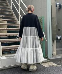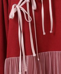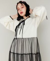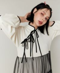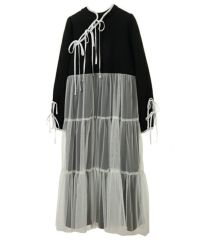 チャイナディテールのフェミニンなワンピース。胸下を切り替えチュール素材をティアード状に重ねたデザイン。配色パイピング&リボンデザインが存在感抜群。垂らしたリボンが着こなしのアクセントに。パイピングにはマットなサテンを使用。身体のラインを拾わない程よくゆったりとしたサイジングでリラクシーな雰囲気に仕上げています。一枚でスタイリングが完成する主役級ワンピース。