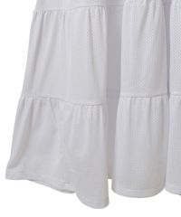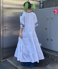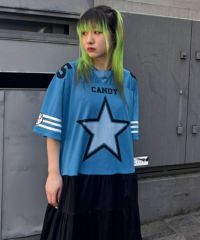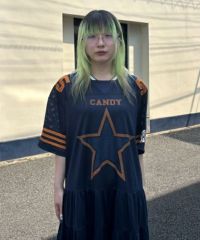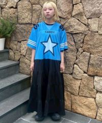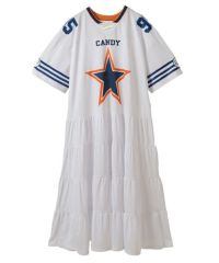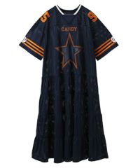 ゲームTシャツのディティールをデザインに落とし込んだ、リメイク風ワンピース。 スポーティなメッシュ素材で、程よいシアー感が夏にぴったりです。 肩のナンバリングと袖口のライン・ロゴ部分はサテン素材で アップリケ刺繍を施しシャイニーなアクセントをプラス。 スカート部分はふんわりとしたティアードデザイン。 ほど良いボリューム感でウエストからフレアに広がるシルエット。 ボトムを組み合わせたレイヤードスタイルがオススメ。 キャンディらしい遊び心を効かせたワンピースです。