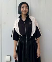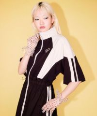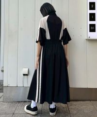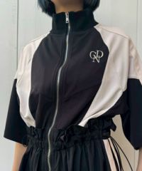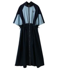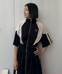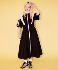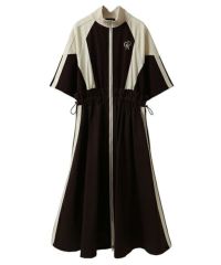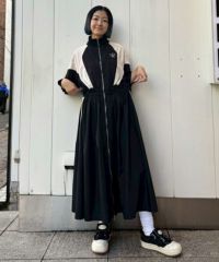 切替配色がスポーティなトラックジャージにギャザースカートをドッキングたしたロングワンピース。 ジャージ部分は軽やかで、程よい伸縮性のあるエステルポンチ素材を使用。 スカート部分は張りのあるタフタ素材を使用。たっぷりとギャザーを施し、ふんわりと広がる立体的なシルエットに。 ウエストにはドローコードを通しており、お好みのバランスにアレンジが可能です。 きゅっと絞ると女性らしいシルエットに。ゆるっと伸ばすと身体のラインを拾いにくい落ち感のあるシルエットになり、 着る人を選ばすストレスフリーな着心地です。 1枚でワンピースとしてはもちろん、ファスナーを開けて軽めのアウターとしてもご着用いただけます。 タウンユースはもちろん、ライブやレジャーシーンなどのイベントにも最適です。