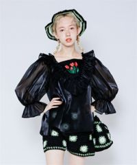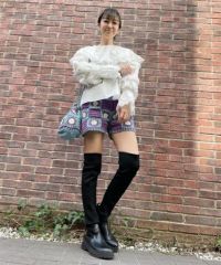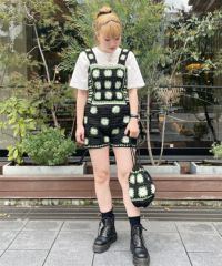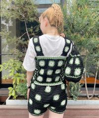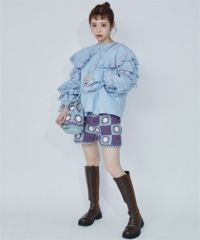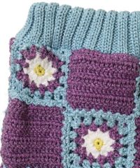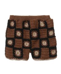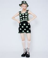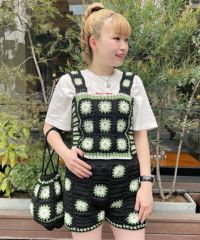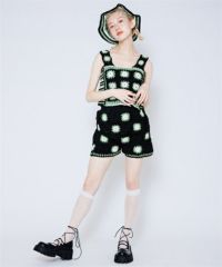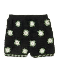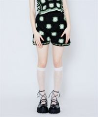 手作業で編まれたフラワーモチーフのかぎ針編みニットショートパンツ。 ラメ糸を使用し、レトロ&POP感のある仕上がりに。 手作業による編み地の違いや柄など、一枚一枚異なる表情をお楽しみいただけます。 ウエストは着脱しやすいゴム仕様、裏地付きなので安心して着用できます。 同素材のキャミソールとのセットアップもオススメ。 ※こちらの商品は1点1点手編みで仕上げている ため、サイズや編み模様に個体差が生じる場合が有ります。 所々に糸の飛び出しや継ぎ目が見られますが手編みならではの風合いになりますのでご了承下さい。