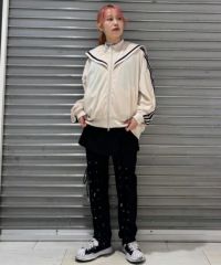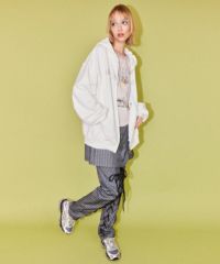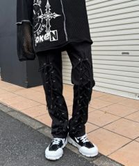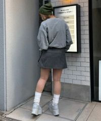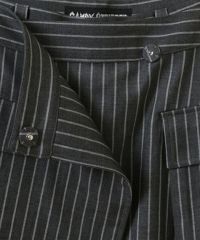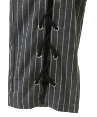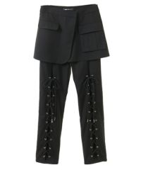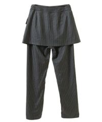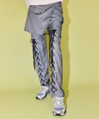 レースアップディティールがインパクト大なレイヤードパンツ。 ラップスカートは取り外しでき、スカート単体でもご着用いただけます。 パンツは細身のシルエットに仕上げスタイリッシュな雰囲気を演出。 シワになりにくく程よい肉感のT/Rツイルを使用しておりお手入れのしやすさも◎ トラッドな雰囲気をお楽しみいただけるストライプ2色とエッジを 効かせたい時に最適なブラック(無地)の3色をご用意。 モードな要素をプラスしたい時に最適なアイテムです。
