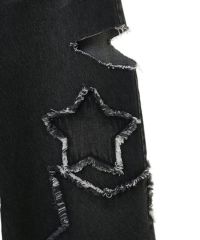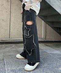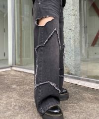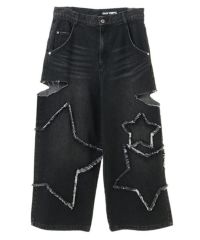 星型のパッチがポイントのデニムパンツ。 着用した際にシルエットがキレイに見えるように10.8オンスの しっかりとした厚みのデニムを使用しています。 ヴィンテージライクな風合いの加工もポイント。 ワイドなシルエットでユニセックスでお楽しみいただけます。 同じ素材・ディティールを使用したデニムジャケットを組み合わせて セットアップで着こなしていただくのもオススメ。 シーズンレスでご着用いただけるアイテムです。