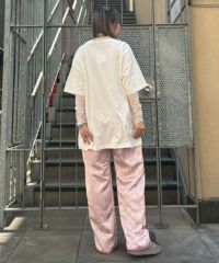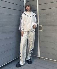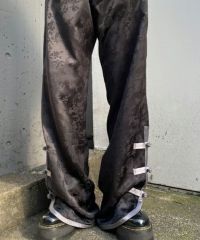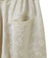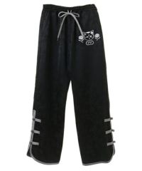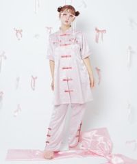 チャイナ風のディティールが目を惹くパンツ。 高級感のあるサテン生地を使用し、ウエスト部分には猫モチーフをさりげなく刺繍しました。 裾に施されたチャイナボタン仕様もアクセントに。 ウエストに通したスピンドルで調節も可能◎ 同シリーズのワンピースと合わせたコーディネートもおすすめです。
