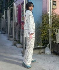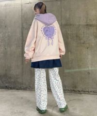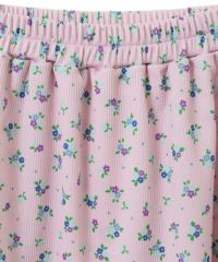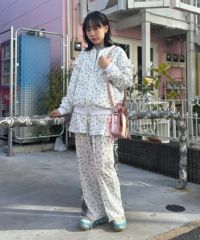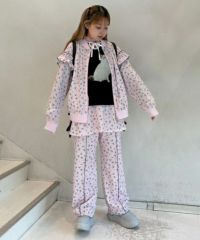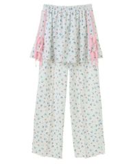 オリジナルの花柄をプリントしたワッフル素材のパンツ。 ウエスト部分はゴム仕様になっており履き心地も抜群。 トレンド感のあるスカートをレイヤードしたデザインで、サイドに入ったラインとリボンがポイント。 同シリーズのブルゾンを合わせたコーディネートもおすすめ◎
