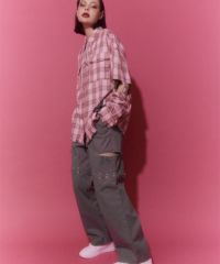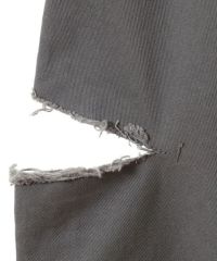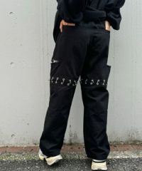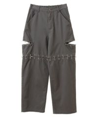 パンキッシュなリングディティールが目を惹くパンツ。 裾に向かって細くなるテーパードシルエットでスッキリとしたバランスでご着用いただけます。 太もも部分にスラッシュを入れて抜け感をプラス。 後ろ側のウエストはゴム仕様になっており着心地も◎ オーバーサイズ~コンパクトなトップスとの相性も抜群です。 コーディネートのアクセントに最適なアイテム。