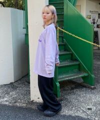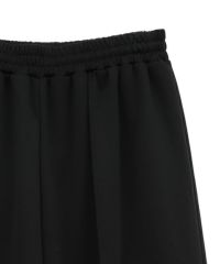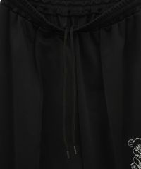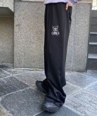 程よい肉感のエステルポンチ素材を使用しワイドなシルエットに仕上げたトラックパンツ。 フロント部分にはセンタープレスを入れてアクセントをプラス。 ウエスト部分はゴム仕様にし、サイズ調整ができるように内側にスピンドルを通しており機能性も◎ ワンポイントで施したアメコミタッチのベアモチーフの刺繍もポイント。 同じグラフィックを使用したコーチジャケットを組み合わせた着こなしはもちろん、 テーラードジャケットやシャツを組み合わせたスポーツミックスなスタイリングもオススメ。 シーズンレスでご着用いただける1着です。