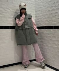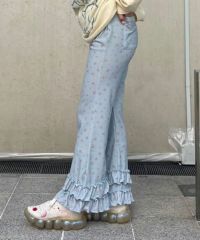 ストレッチの効いたニットコーデュロイ素材を使用したフレアパンツ。 ウエスト部分はオールゴム仕様になっておりストレスフリーな履き心地に。 タイトすぎない程よくゆったりとしたフレアシルエットで脚長効果も◎ ピンク・ライトブルーはガーリーな雰囲気をお楽しみいただける 花柄のニットコーデュロイ、ブラックは無地のニットコーデュロイを使用しています。 長めのトップスやワンピースの下にレイヤードしていただくのもオススメ。 幅広いスタイリングにマッチする万能アイテムです。
