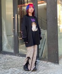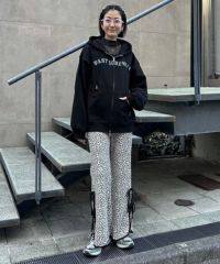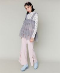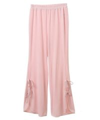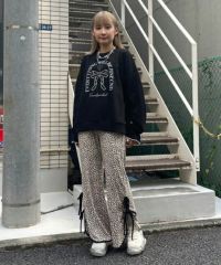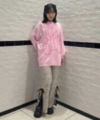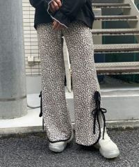 ストレッチの効いたニットコーデュロイ素材を使用したフレアパンツ。ウエスト部分はオールゴム仕様になっておりストレスフリーな履き心地に。タイトすぎない程よくゆったりとしたフレアシルエットで脚長効果も◎サイドにスリット入りで抜け感をプラス。サイドをリボンで結ぶデザインで、垂らしたリボンが着こなしのアクセントに。ベーシックにご着用いただけるピンク・ブラック(無地)とスタイリングのアクセントに最適なレオパード柄をご用意しました。合わせやすさとこなれ感が両立した、着まわし力も抜群のアイテム。
