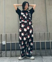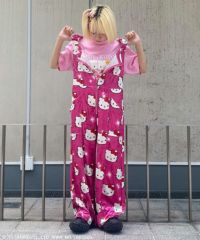 クラッシュベロアにハローキティのオリジナルプリントを施したサロペット。 ゆとりを持たせたシルエットでリラクシーな雰囲気を演出。 パンツ部分にセンタープレスを入れることで脚長効果も◎ タウンユースはもちろん、ルームウェアとしてもオススメ。 1枚で主役級にキマるアイテムに仕上がりました。