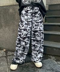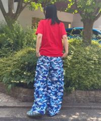 軽やかな質感のエステルタフタ素材を使用したカーゴパンツ。 オリジナルキャラクターの「PEPE」をカモフラージュ柄に落とし込んだ総柄がインパクト大。 程よいワイドシルエットで、オーバーシルエットのトップスはもちろん コンパクトサイズのトップスまで様々なトップスと相性も◎ ウエスト部分はゴム仕様にすることでストレスフリーな着心地に。 同じカモフラージュ柄を使用したナンバリングトップスを組み合わせた着こなしもオススメ。 夏のストリートスタイルに最適な1着です。