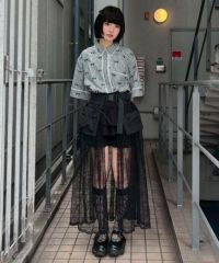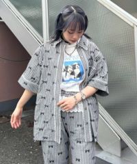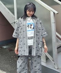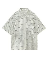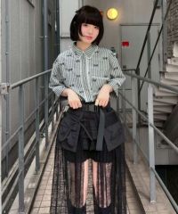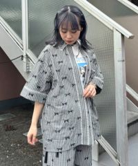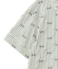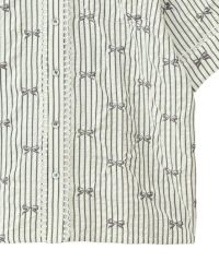オリジナルのリボン柄をストライプ素材に刺繍したシャツ。 衿や前立て、袖口の切り替え部分にさりげなく挟んだチュールレースもポイント。 ベーシックでシンプルなシルエットで、カジュアルにもガーリーにもご着用いただけます。 同素材を使用したパンツと合わせたセットアップのコーディネートはもちろん、 インナーにキャミソールやコンパクトTを合わせ、羽織としてのご着用もおすすめです。