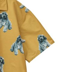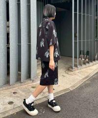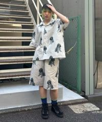 犬モチーフの総柄プリントが目を惹くタフタ素材のシャツ。 程よくゆったりとしたシルエットで、ボタンを閉めてトップスとしてはもちろん羽織としてもご着用いただけます。 夏フェスやレジャーシーンでも◎ 同柄のハーフパンツを合わせたセットアップのコーディネートもおすすめです。