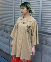 身頃に刺繍で表現した猫の妖怪モチーフがインパクト大なチャイナシャツ。 しなやかな質感のレーヨン混のブロード素材を使用し着心地も◎ オーバーシルエットなサイジングでユニセックスでお楽しみいただけます。 シャツとしてはもちろん、ボタンを開けて軽めの羽織りにも最適です。 ダメージデニムやトラックパンツを組み合わせた着こなしがオススメ。 ストリートスタイルにぴったりな1枚です。