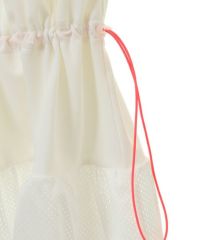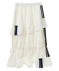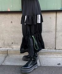 軽やかなジャージ素材のロングスカート。 ウエスト部分はゴム仕様になっておりストレスフリーな履き心地。 サイドに入ったラインと、ボリューミーなメッシュのフリルがポイント。 裾部分には左右で絞れるネオンカラーのゴム入りで、お好みのシルエットでご着用いただけます。