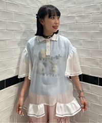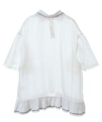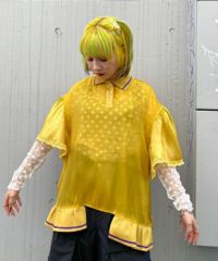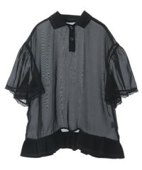 光沢感のあるオーガンジー素材を使用したポロトップス。 裾の編み立てリブのフリルや袖口のレース使いなどリメイク感のあるディティールもポイント。 着こなし次第で幅広いスタイリングにハマります。 遊び心のあるアイテムに仕上がりました。