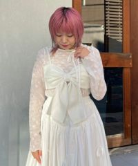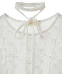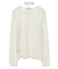 程よくストレッチの効いたリボン柄のストレッチチュールを使用したシースルートップス。 合わせやすいラウンドネックデザイン。 同素材で作られたチョーカー付き。首に巻きつけることで今季のムードを取り入れられるアイテム。 身頃のランジェリーライクなメロー切り替えで女性らしさをプラス。 程よいタイトなシルエットで1枚ではもちろん、レイヤードアイテムとしても最適。 春のアクセントカラーに最適なピンク、 ジャンルレスで活躍するオフホワイト・ブラックの3色をご用意。 カジュアルガーリーな着こなしに最適です。