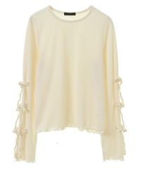 適度な肉感で1枚で着用しやすい、しなやかな肌触りのT/Rテレコ素材を使用したトップス。 両袖のリボンディティールでアクセントをプラスしています。 1枚ではもちろん、ワンピース等のインナーにも最適。 同じ素材・ディティールを使用したフレアパンツを組み合わせていただくのもオススメ。 スタイリングに取り入れやすい、アイボリー・グレー・ブラックの3色展開。 1枚あると活躍する万能アイテムです。