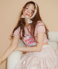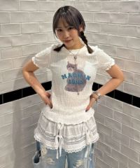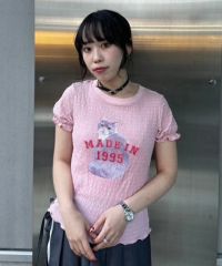 フロントのフォトプリントがキュートなトップス。 シャーリング加工された素材を使用し、カジュアルガーリーな印象に。 袖口にはゴムを入れ、ふんわりしたシルエットに仕上げました。 1枚で着るのはもちろん、シアーアイテムのインナーとしてもおすすめ◎