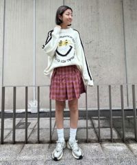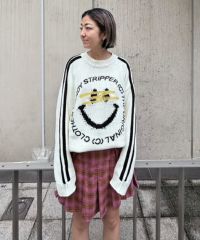 ローゲージでざっくりとした風合いに仕上げたスマイルモチーフのニットトップス。 肩~袖のライン使い・ポップなカラーリングがポイント。 程よいオーバーシルエットでスカートにもパンツにも相性が良いサイズ感に仕上げています。 着丈に前後差を付けることでスタイルアップ効果も◎ コーディネートのアクセントに最適なアイテムです。