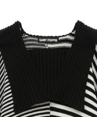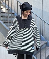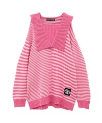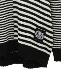 太さの異なるボーダーを組み合わせたセーラーカラーニット。裾・袖口リブに細かめのダメージ加工を施しパンキッシュなアクセントをプラス。左下に付いている「CND」ロゴの織りネームもポイント。程よいオーバーシルエットなサイジングでユニセックスでお楽しみいただけます。スタイリングのアクセントに最適なMINT×LIGHT BLUE・PINK×LIGHT PINKのボーダーとモードな雰囲気のBLACK×OFF WHITEボーダーの3色をご用意。同じ織りネームを使用したビーニーを組み合わせていただくのもオススメ。キャンディらしい遊び心の効いた1枚をお楽しみください。