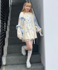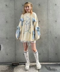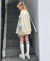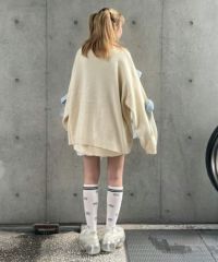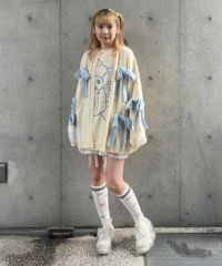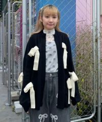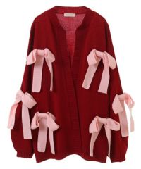 ニット素材のリボンを散りばめたカーディガンがカラーリング新たに再登場! 春先にぴったりなアクリル素材で、薄手の編み地にリニューアルしました。 あえて前立てにボタンはつけず、さらっと羽織れるようゆったりしたシルエットに。 袖口はボリュームを出し、ガーリーな印象に仕上げました。
