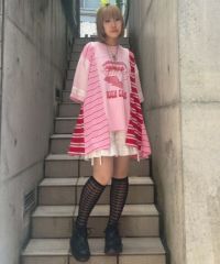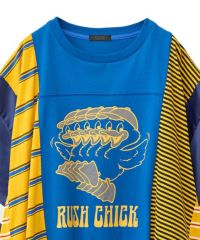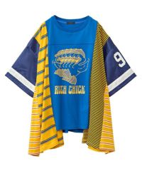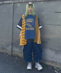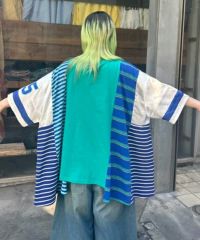キャンディらしいリメイク風のデザインがインパクト大なTシャツ。 ボーダー柄のカットソー素材を切り替えて使用しアクセントをプラス。 身幅を大きめにし落ち感のあるシルエットにすることで 身体のラインが出にくくバランスが良く見えるように仕上げました。 アメコミタッチのファニーフェイスなダッグモチーフのグラフィックや 両袖のナンバリング・ラインもポイント。 ワイドシルエットのボトムはもちろん、ショート丈のパンツとも相性◎ 1枚で主役級にキマるアイテムです。