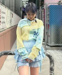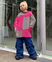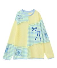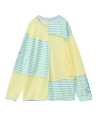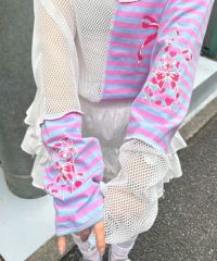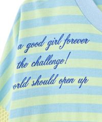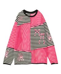 メッシュ素材とボーダーのカットソー素材を組み合わせたトップス。 切り替え部分のパンキッシュなディティール使いもポイント。 ランダムにあしらったアニマルモチーフやリボン・ロゴのグラフィックで キャンディらしい遊び心をプラスしました。 程よい透け感が楽しめる夏らしい1枚です。