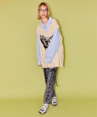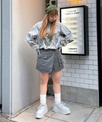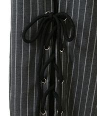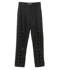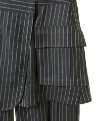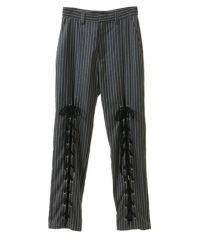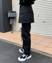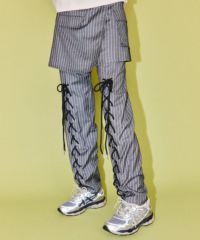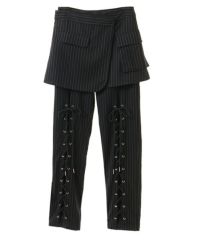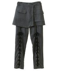 レースアップディティールがインパクト大なレイヤードパンツ。 ラップスカートは取り外しでき、スカート単体でもご着用いただけます。 パンツは細身のシルエットに仕上げスタイリッシュな雰囲気を演出。 シワになりにくく程よい肉感のT/Rツイルを使用しておりお手入れのしやすさも◎ トラッドな雰囲気をお楽しみいただけるストライプ2色とエッジを 効かせたい時に最適なブラック(無地)の3色をご用意。 モードな要素をプラスしたい時に最適なアイテムです。