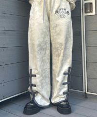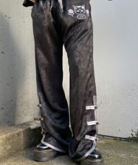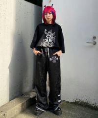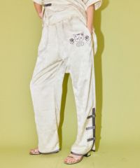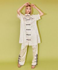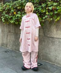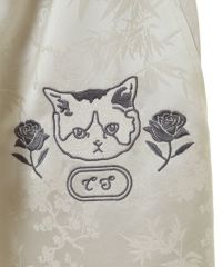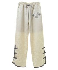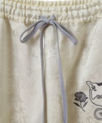 チャイナ風のディティールが目を惹くパンツ。 高級感のあるサテン生地を使用し、ウエスト部分には猫モチーフをさりげなく刺繍しました。 裾に施されたチャイナボタン仕様もアクセントに。 ウエストに通したスピンドルで調節も可能◎ 同シリーズのワンピースと合わせたコーディネートもおすすめです。