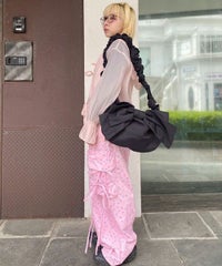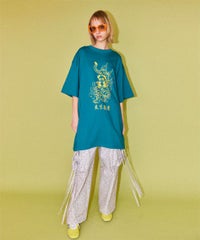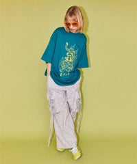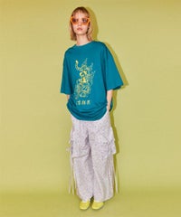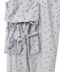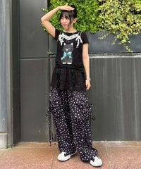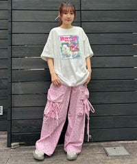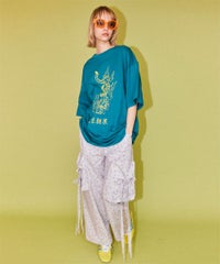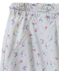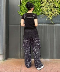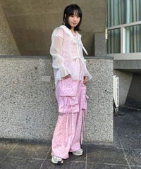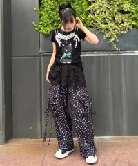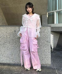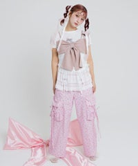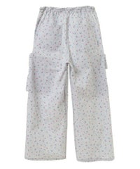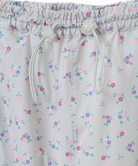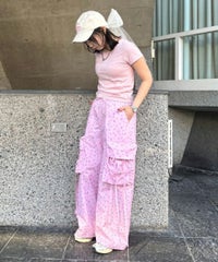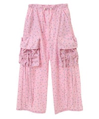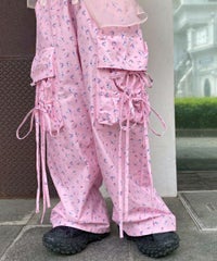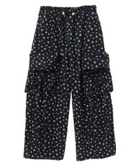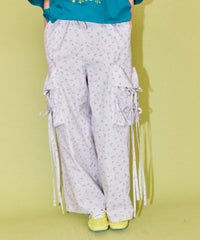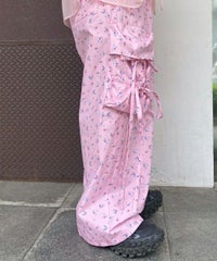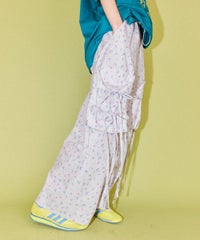 軽やかなエステルタフタ素材に、オリジナルの花柄をプリントしたカーゴパンツ。 サイドポケットの長く垂らしたリボン仕様もポイント。 ウエスト部分はゴムを絞れる仕様になっており、お好みで調節が可能。 太すぎない程よいサイズ感で、着る人を選ばない万能アイテムです。