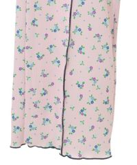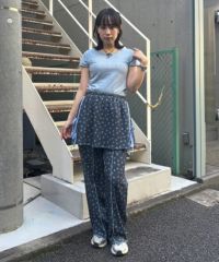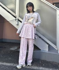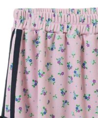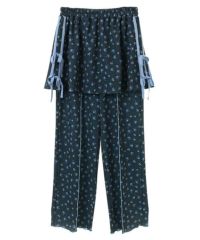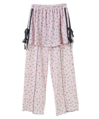 オリジナルの花柄をプリントしたワッフル素材のパンツ。 ウエスト部分はゴム仕様になっており履き心地も抜群。 トレンド感のあるスカートをレイヤードしたデザインで、サイドに入ったラインとリボンがポイント。 同シリーズのブルゾンを合わせたコーディネートもおすすめ◎